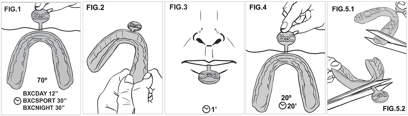 3.Segurar no protetor pela parte saliente com o logótipo do produto e submergi-lo completamente na água durante 12 segundos (BXCDAY) e 30 segusndos (BXCNIGHT e BXCSPORT), conforme a FIG. 1.